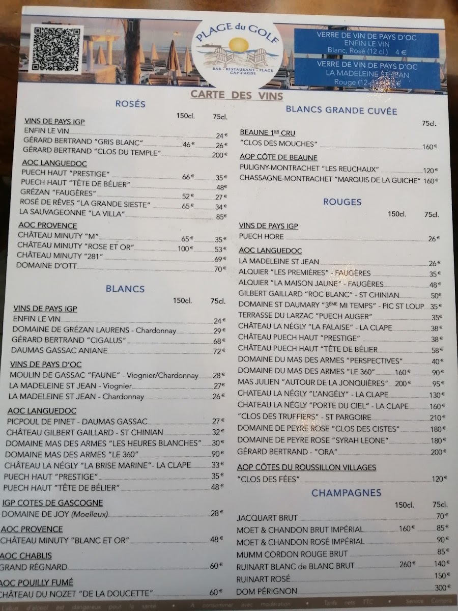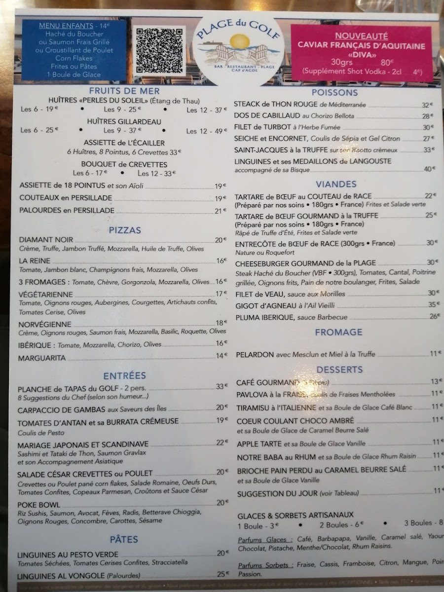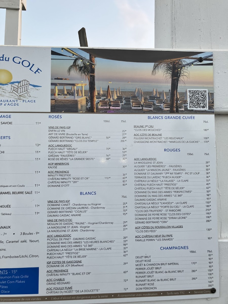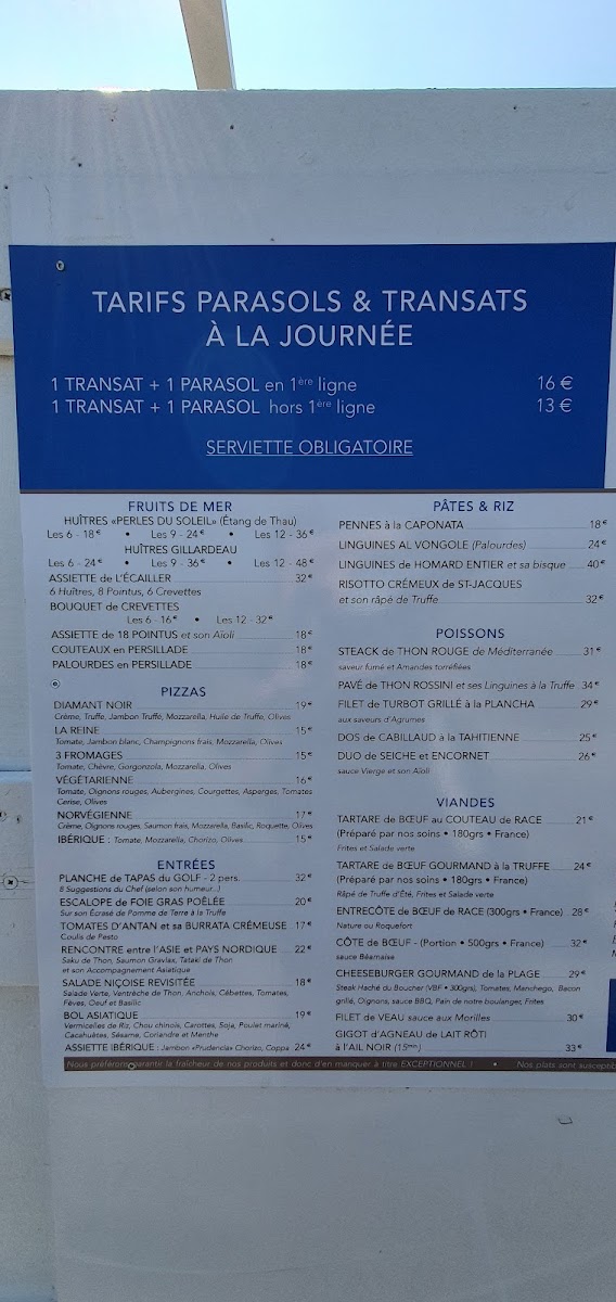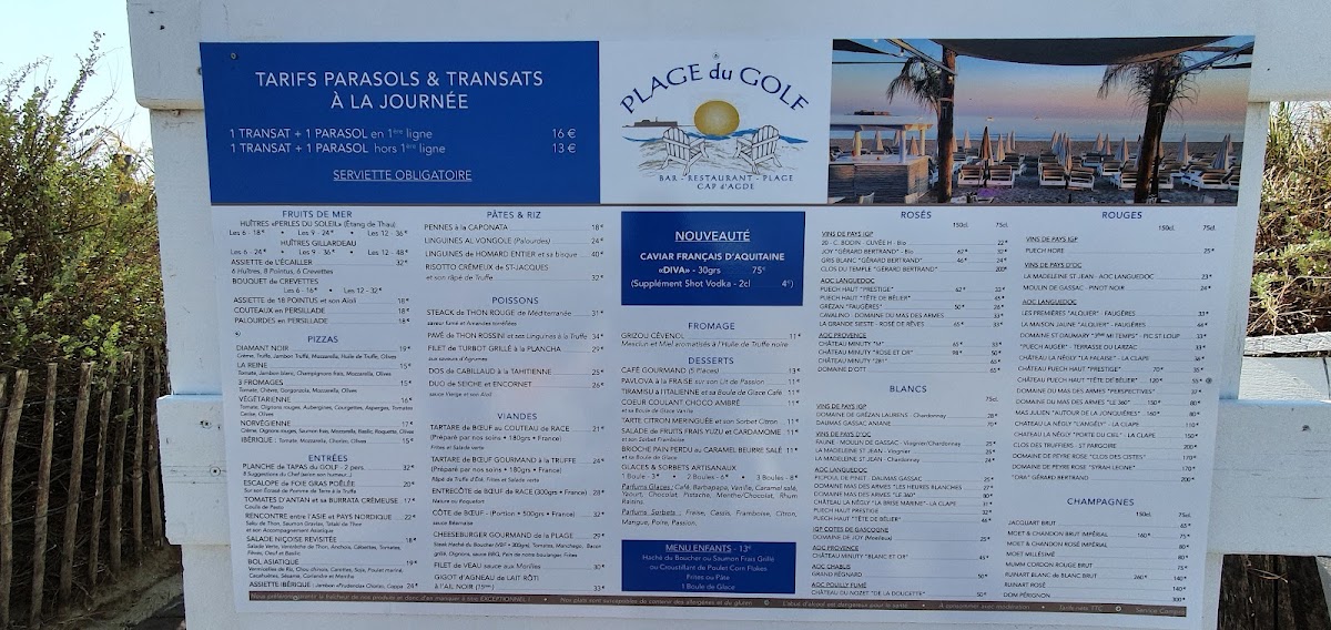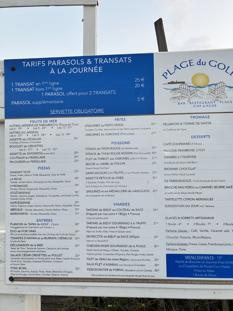 Welcome to Plage du Golf, a hidden gem located on the idyllic Ile des Loisirs at Plage Richelieu Est, Cap d'Agde, France. This enchanting beach club is perfect for those seeking sun, sand, and delectable cuisine. The menu, which features a delightful array of French specialties, is available from early morning until late, with the main kitchen opening at 8 PM, allowing for leisurely dining paired with stunning ocean views.